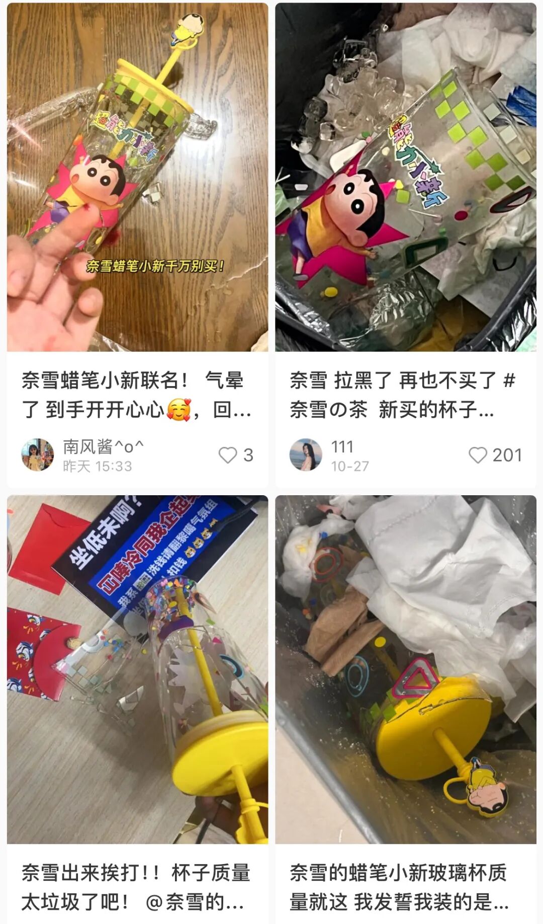 被疯抢的蜡笔小新玻璃杯,一碰即“碎”,将纪念品做成了一次性物品,价不配位的拉胯质量给粉丝带来了极其糟心的消费体验。
