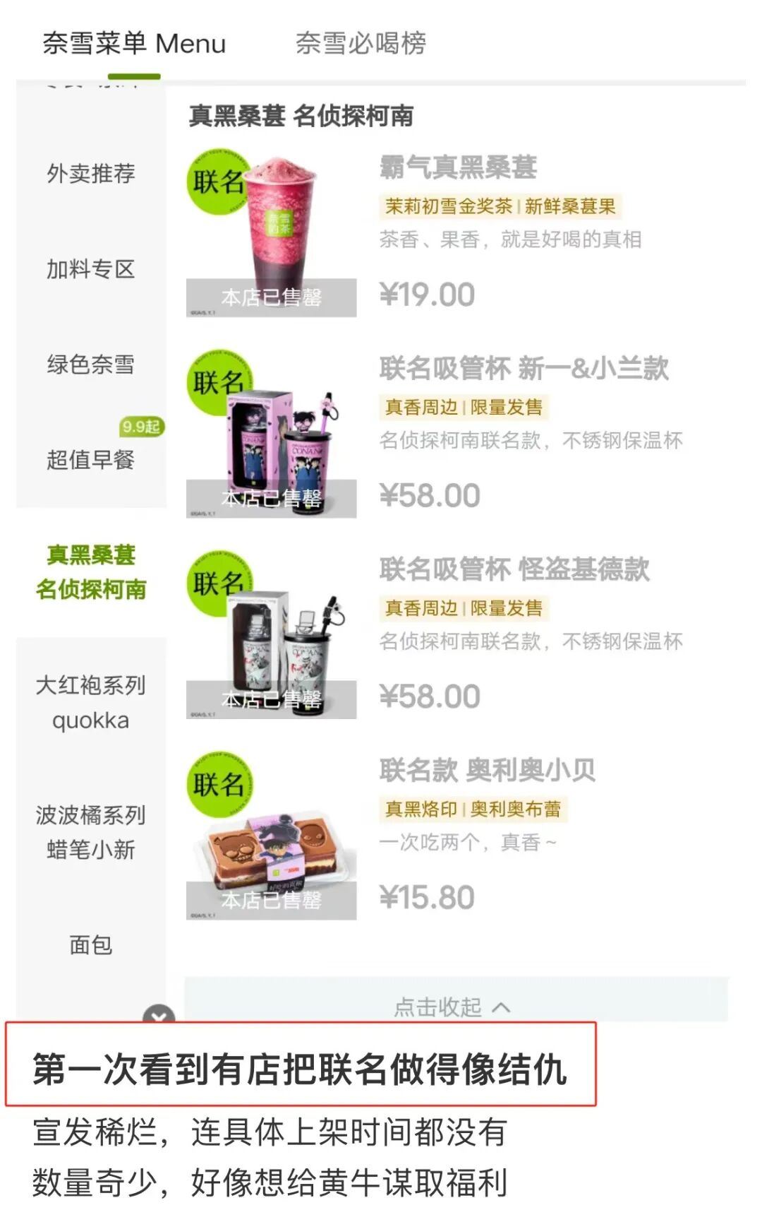 奈雪的茶频繁联名背后,暴露出了新茶饮的流量“焦虑”。口味推新卷到极致,创新空间收窄,茶饮品牌不得不寻求新的销量增长方式。自带流量热度,拥有庞大粉丝受众的经典IP,无疑是茶饮品牌的绝佳“捷径”选择。奈雪疯狂开展IP联名,过于追求销量,往往就落下了质量和口碑。社交平台上,关于奈雪的茶周边避雷吐槽贴层出不穷,几乎席卷每一个联名。譬如,柯南联名宣发跟不上,数量奇少,硬生生把理应圈粉的联名演变成结仇现场,惹怒一众柯迷。