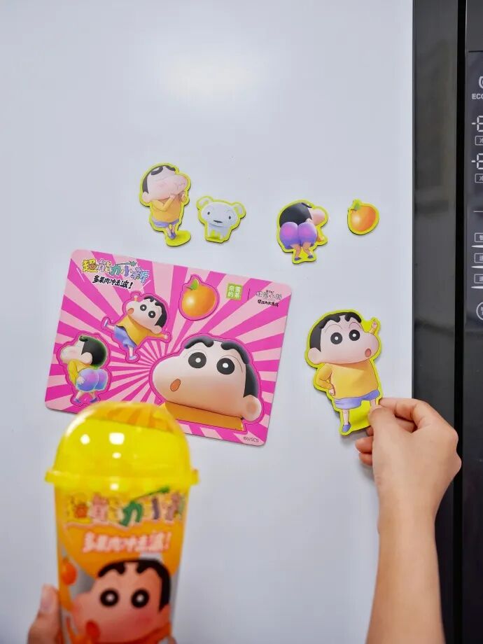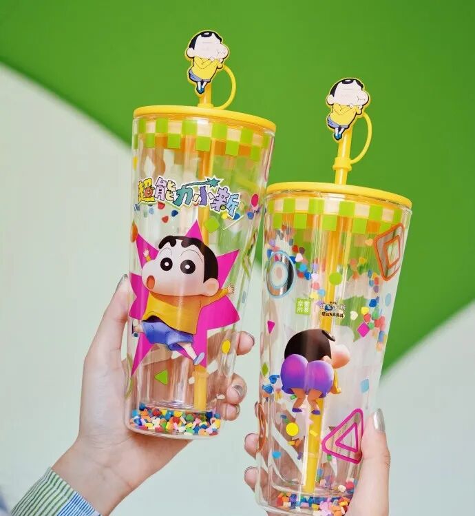以及双层玻璃摇摇杯,多巴胺配色+“污王”小新的标志性扭屁股动作,快乐氛围就要溢出屏幕。