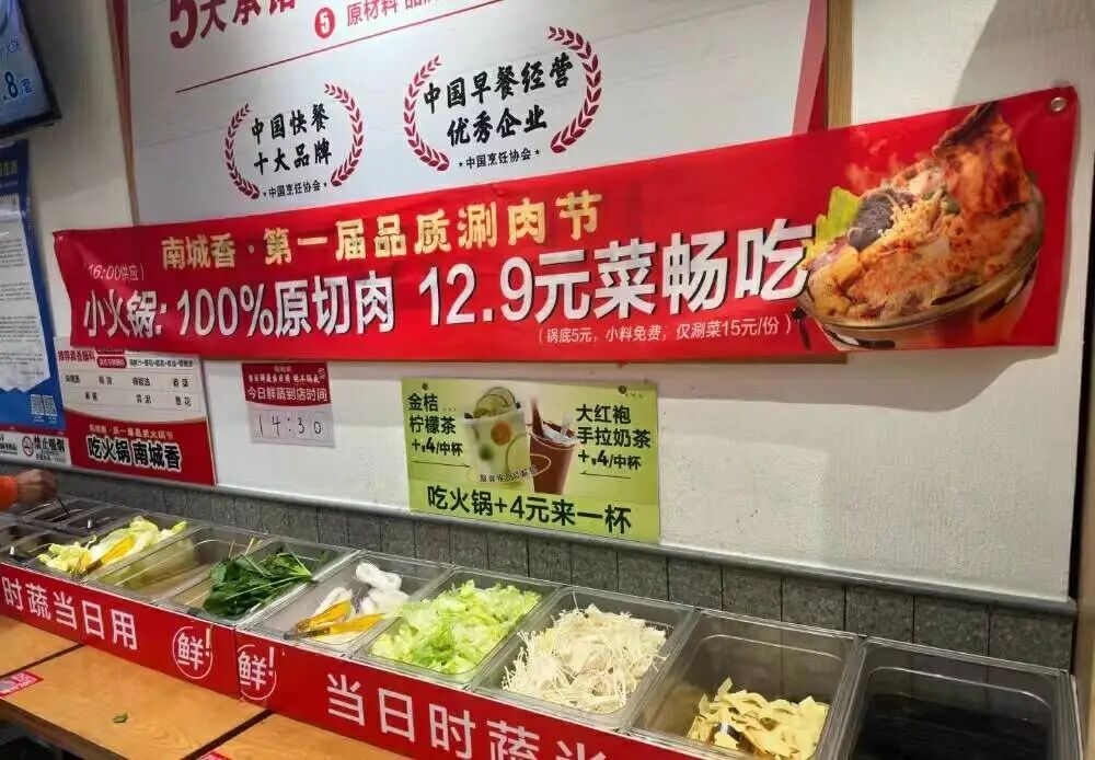 另外,南城香上半年也以早餐优惠套餐,加入“价格战”行列。现磨豆浆和粥品3元无限续,打造早晚两餐性价比餐饮,有网友感叹,“本以为3元无限量饮品够狠了,这次的小火锅更狠。”