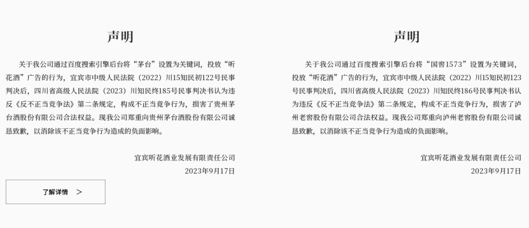 甚至还因为以“茅台”、“国窖1573”等关键词投放广告被告上法庭,直到现在,听花酒对茅台、泸州老窖的道歉信还在自家官网上挂着。