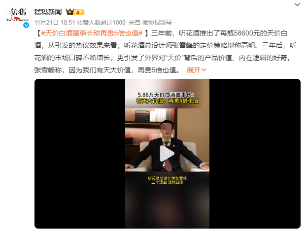 当然,并不是说其本身就高达58600一瓶的价格是否太贵,而是董事长张雪峰的发言实在过于“狂妄”。