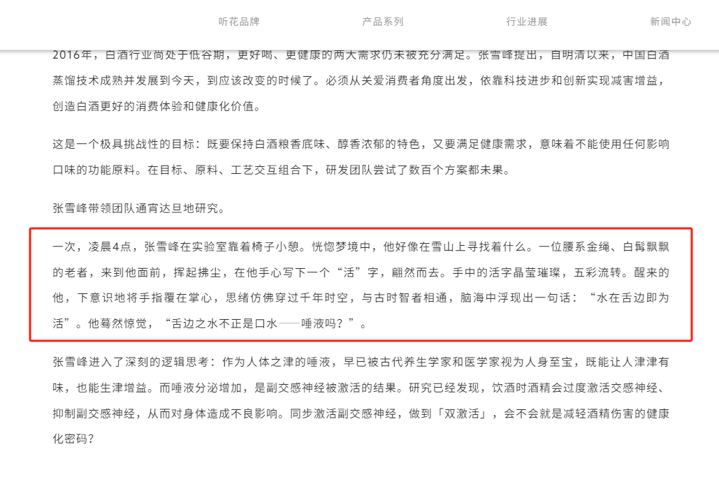 事实上,在听花酒诞生之后,除了“双激活”理论之外,张雪峰还总把“减害增益”工艺挂在嘴边,用醇熟老酒为原材料,经过复杂工艺喝下去能够“落口生津”,实现白酒的“全新饮用价值”。