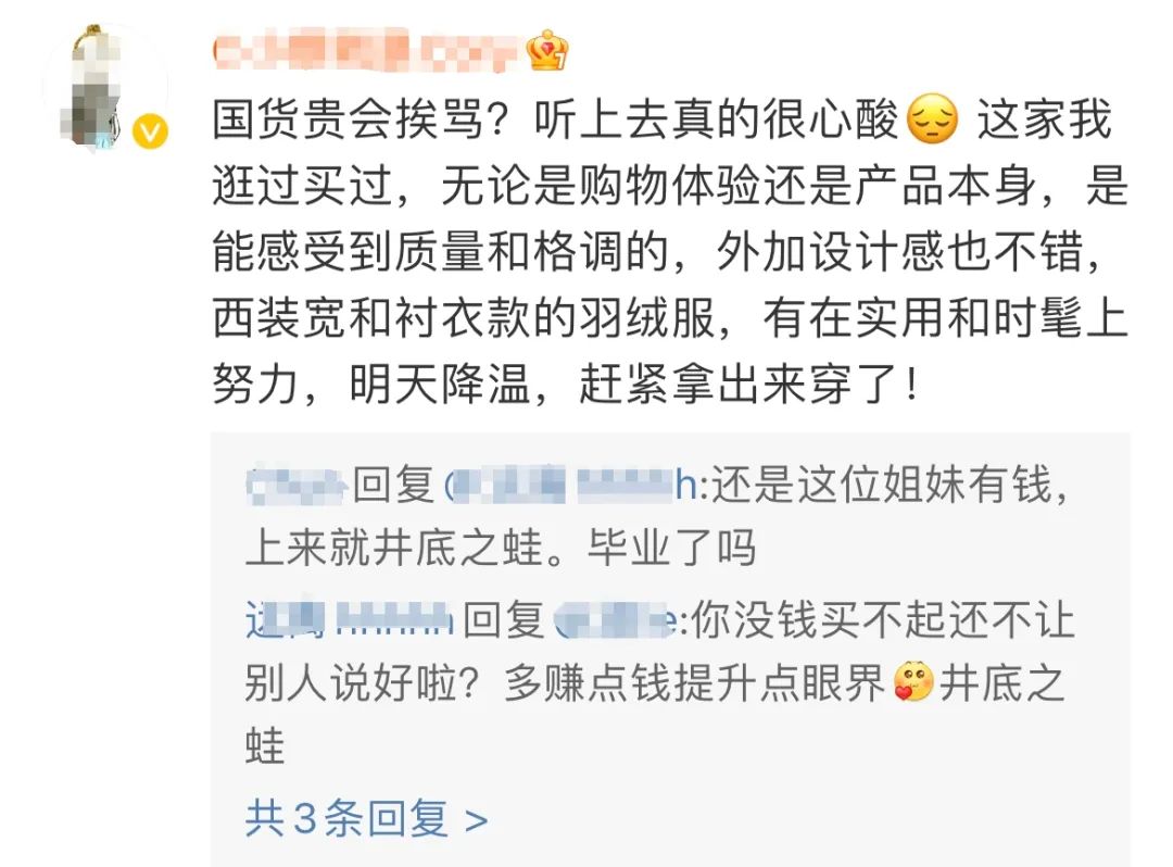 另一方面,进行初步的用户筛选,并树起“天空人,国产高端羽绒服”的形象。天空人早就知道,肯定有人会质疑、吐槽它的定位,但它并不在意(要不然也不会放出这些评论),它要的是:虽然你骂它,但也能记住“天空人,卖得好贵”这一关键信息;如果你好奇它为啥卖这么贵,那你很可能会成为它的潜在用户;如果你是它的老用户,这时候你很可能站出来为它辩解两句了。