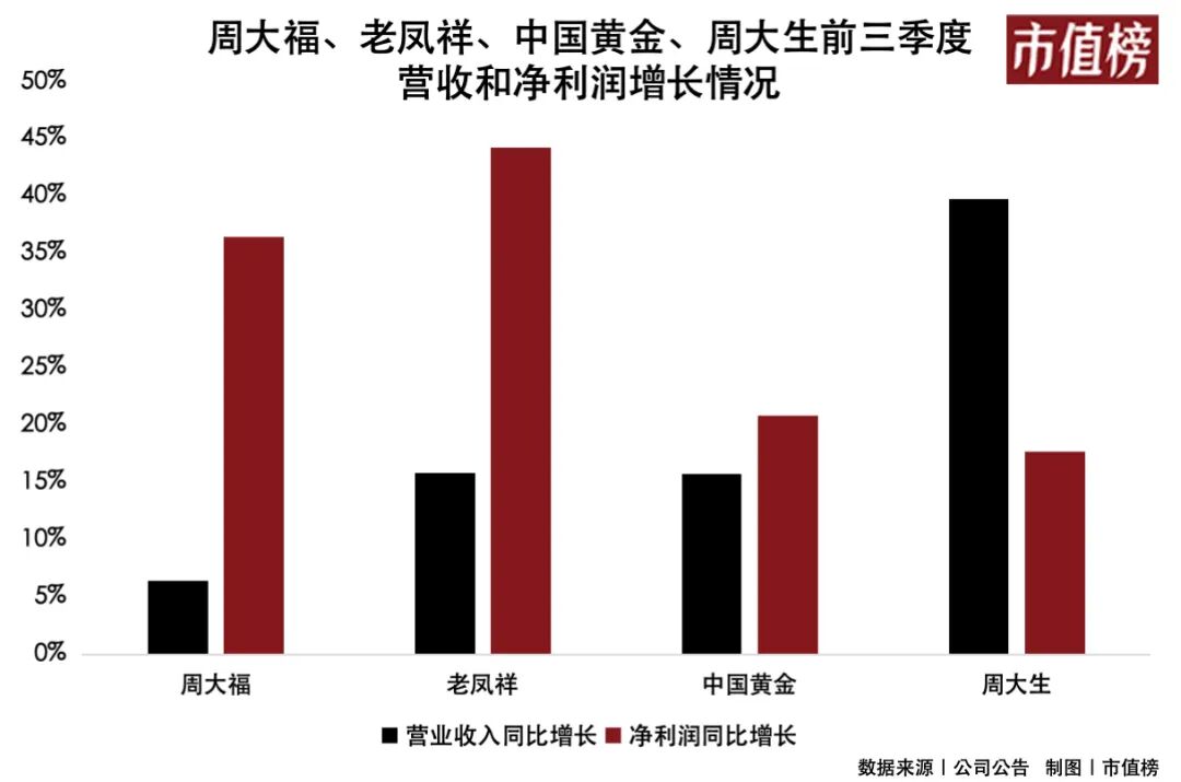 从已披露的财务数据看,周大福(2023.4.1-9.30)营业收入同比增长6.43%,老凤祥同比增长15.9%,中国黄金同比增长15.76%,周大生同比增长39.81%。