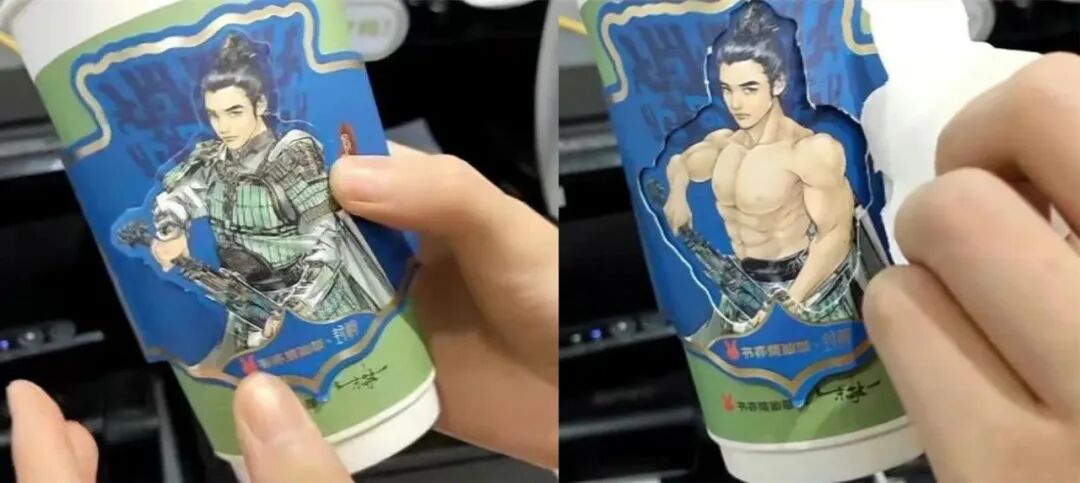 乍一看联名的杯子平平无奇,结果包装竟然是可撕的。一撕衣服就能露出电影角色的同款胸肌、腹肌,送的人物闪卡也是将擦边进行了到底,衣服时有时无的。