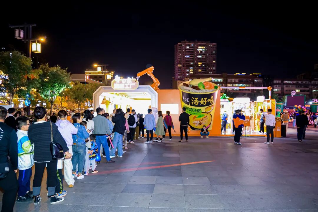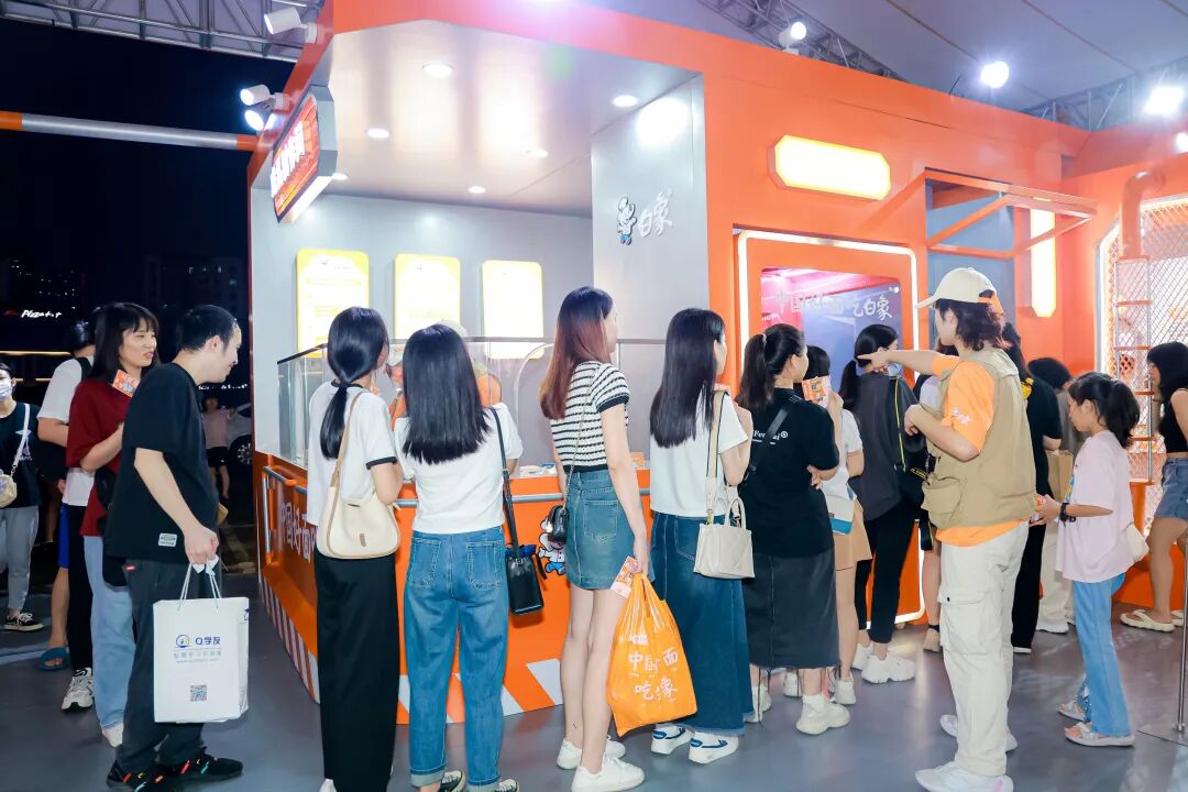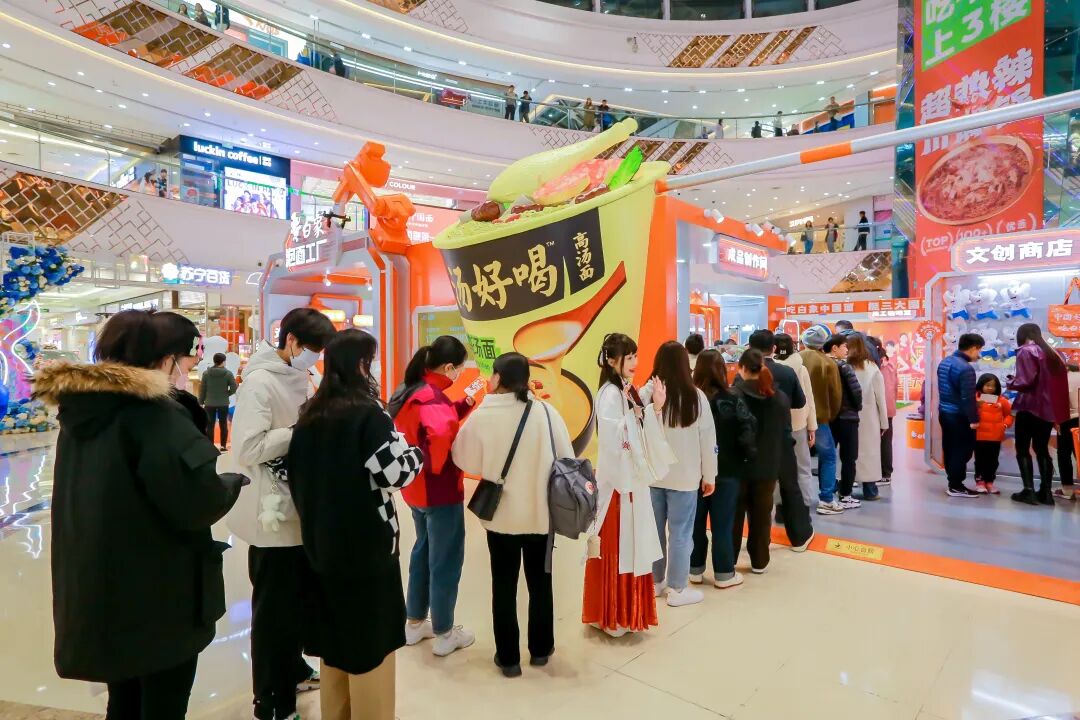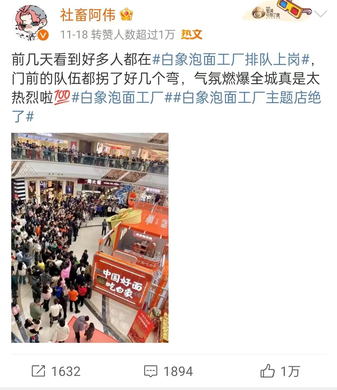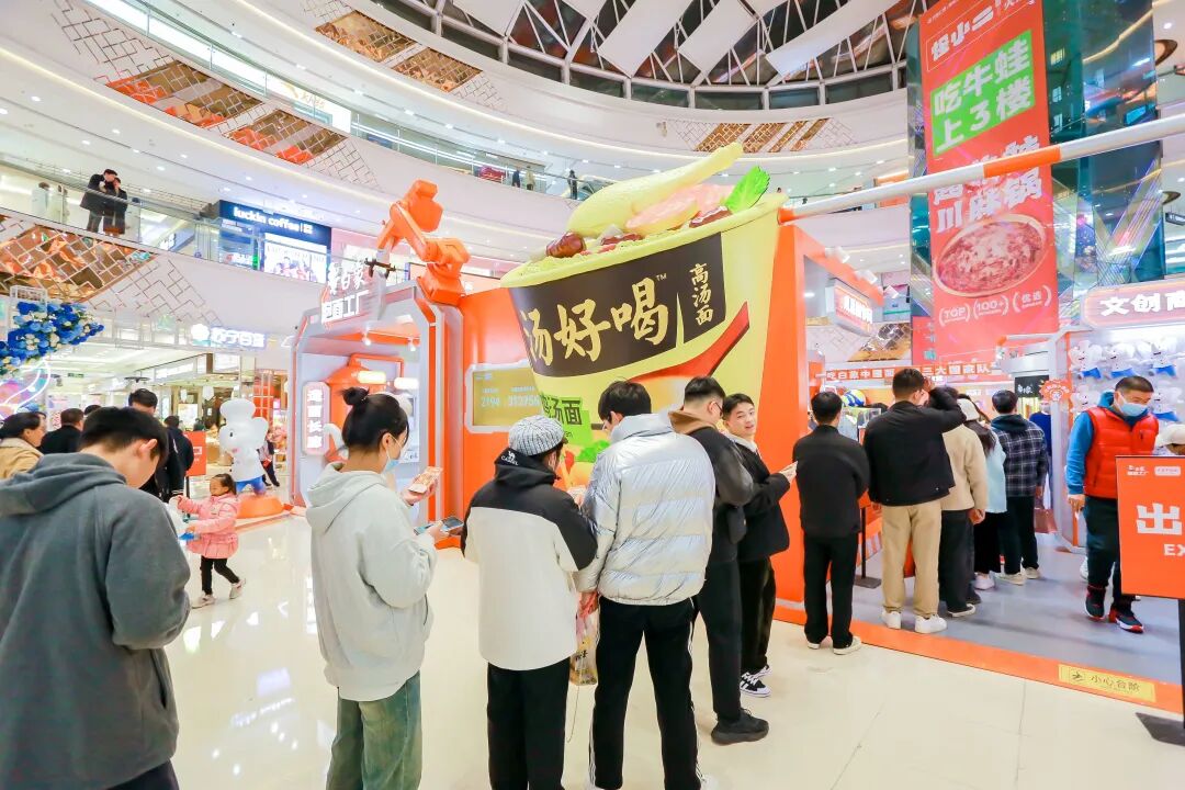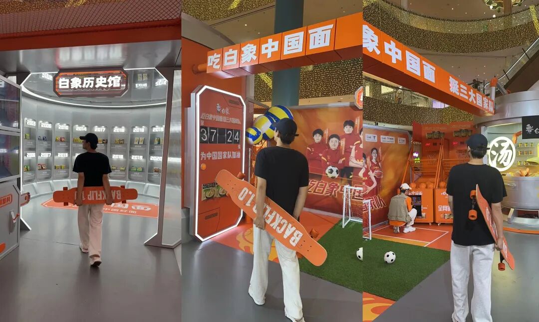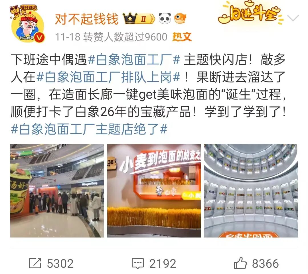 要说【白象泡面工厂】之所以火爆,还得从去年说起。去年11月开始,火爆全网的【白象泡面工厂】沉浸式主题店第1季席卷全国,历经8个月,遍布全国21城,吸引近30W人线下参观,每城均大排长龙,成为了行业首创的爆款出圈案例。 第2季【白象泡面工厂】IP经过品牌升级之后终于又强势回归,并于今年下半年空降杭州、北京、太原、广州、郑州等13城,在全国各地掀起排队上岗热潮。密密麻麻的队伍能绕商城半个圈。上次见到这种景象的时候,还是国庆出游逛热门景点。现场可谓人山人海,更有意思的是,现场还吸引了各种身份、不同职业的「新新人类」。Ta们因身份特殊,画风清奇,成为第2季【白象泡面工厂】主题快闪店的一群“显眼包”。有人偶遇了蔡文姬、大乔、西施和嫦娥等游戏角色,他们大玩cosplay,有一种游戏角色走入现实的不真实感。还有人偶遇了胡桃和大乔在投篮,真是令人意想不到的次元跨越,游戏中,胡桃和大乔法术高超,第2季【白象泡面工厂】主题快闪店内,小姐姐们投篮技能满点。场内还惊现王者荣耀的瑶和曜打卡,简直配一脸,不好意思,这对峡谷CP我先磕为敬。连西施和嫦娥小姐姐也慕名前来,【白象泡面工厂】你的魅力可真不小!快闪店现场互动装置太过亮眼,还吸引了jk、洛丽塔、汉服小姐姐前去排队上岗,并在现场美美拍照,小姐姐们各个颜值爆表,成为一道靓丽的风景线。不仅有漂亮小姐姐,也有帅气小哥哥,u1s1,这位滑板小哥哥的橙色滑板和白象现场装置还挺搭。除此之外,竟然还有饿了么小哥外卖都不送了,改来【白象泡面工厂】上岗。好家伙,这场面也是头一回见。就连传说中的卖崽青蛙也来“上岗”了!生活不易、人艰不拆,穿上青蛙服,就是最强“显眼包”。咱就是说,这年头快闪店都这么卷了吗?我说白象你也太会整活了吧,这么会玩不要命啦!02