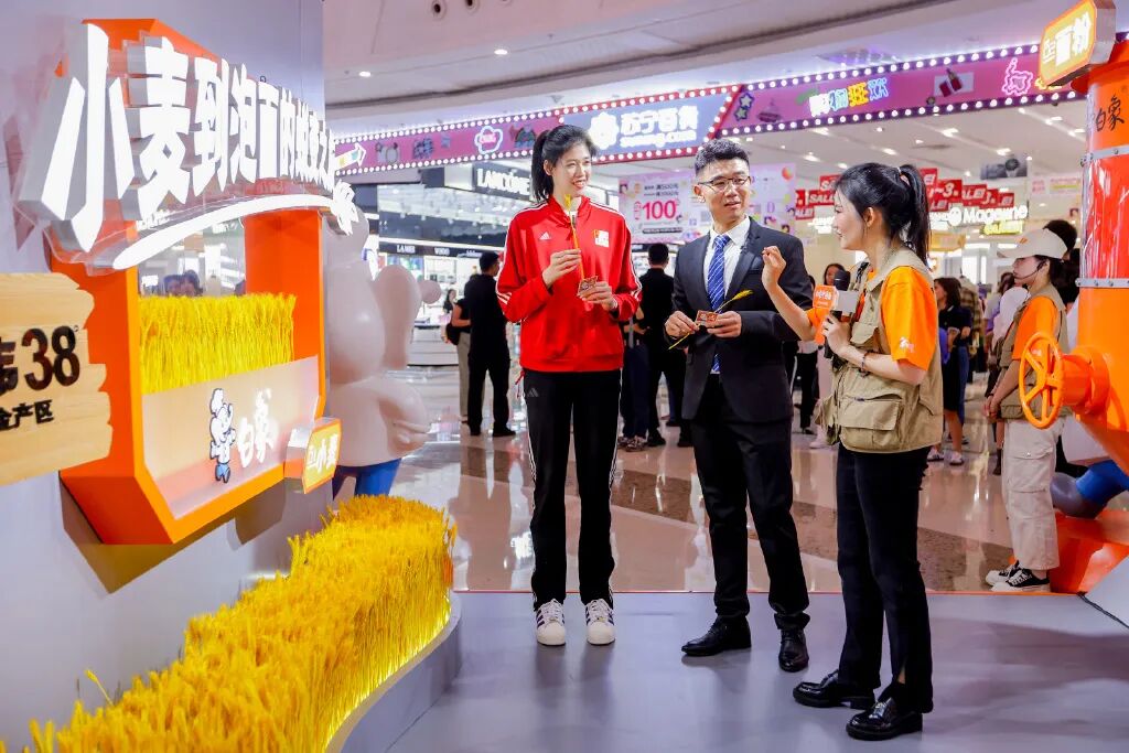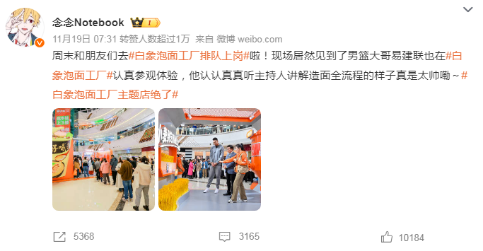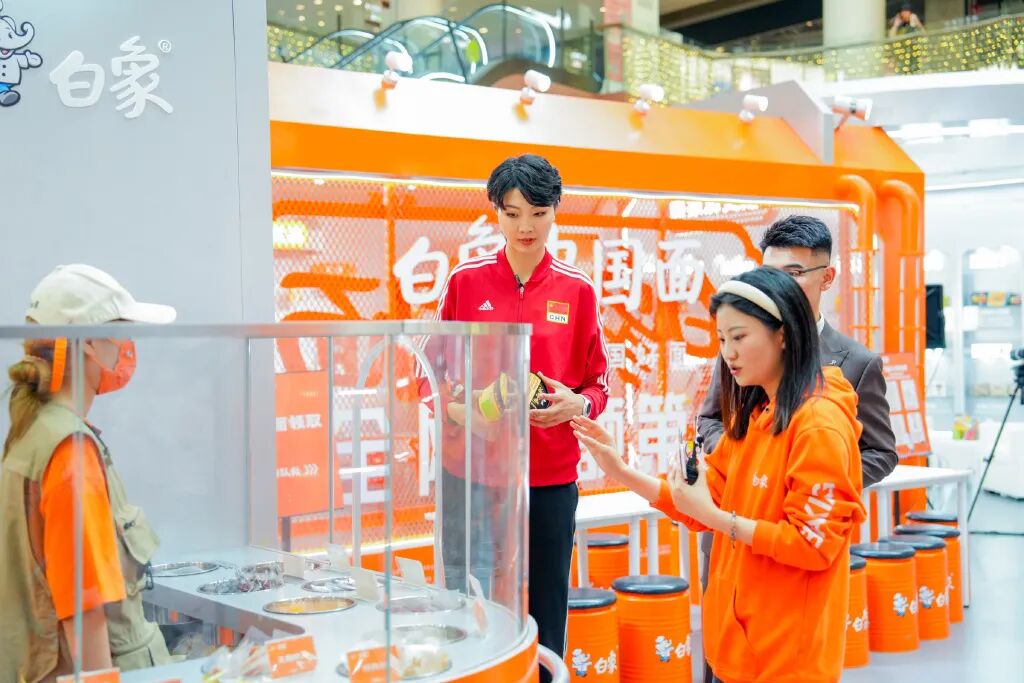 本以为【白象泡面工厂】主题快闪店参观阵容已经够强大了,直到我看到有些网友发的打卡照,才发现事情并没那么简单......有人居然在现场见到了中国男篮“老大哥”易建联,这是什么神仙运气!对于球迷来说,参观快闪店还能偶遇偶像,追星成功简直不要太幸福了吧!还有不少小伙伴们在现场偶遇了女篮运动员韩旭、女排运动员袁心玥、李盈莹前来打卡体验,引来一大波球迷和路人围观。今年7月起,白象陆续签约足、排、篮三大球女子国家队,成为第一家也是唯一一家同时签约女子“三大球”国家队的中国品牌。 此次【白象泡面工厂】主题快闪店,这些知名运动员们化身白象中国面冠军体验官,与广大网友一起来现场排队打卡,参与游戏互动,体验DIY的乐趣,一整个参与感爆棚!异地的网友们纷纷流下了羡慕的泪水,希望【白象泡面工厂】火速开到自己的城市,自己也想体验一把“持证打卡”的快乐。太卷了朋友们,白象不仅会做面,还会“整活”,甚至能请来奥运冠军,真是赢麻了!03