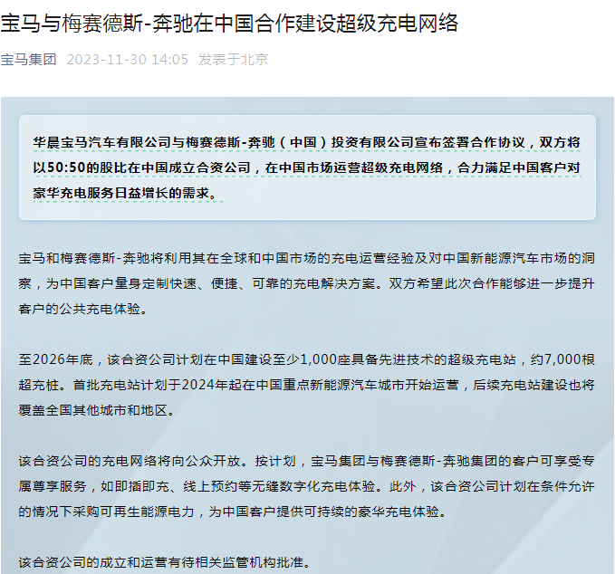 是这样的,11月30日,宝马集团与梅赛德斯-奔驰官方均发布消息称,双方将以五五开的股份比在中国成立合资公司,合作建设和运营超级充电网络。