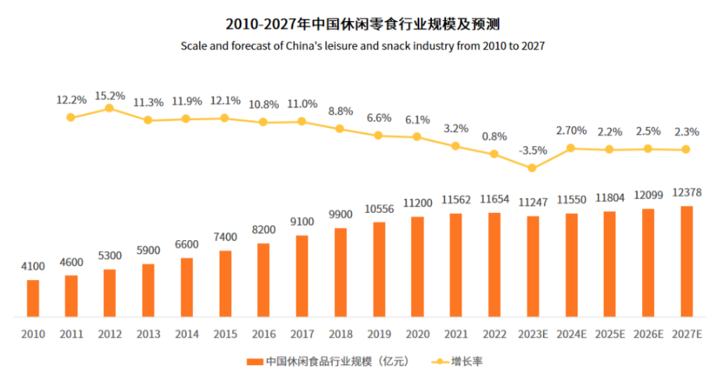 根据艾媒咨询数据显示,我国休闲零食市场的增速正在由快速转为缓慢。2011-2022年间国内休闲食品市场规模从4600亿增长到了1.16万亿,但增速却从此前的12%下降到了0.8%,根据预测往后的增速基本也只能维持在2%左右。