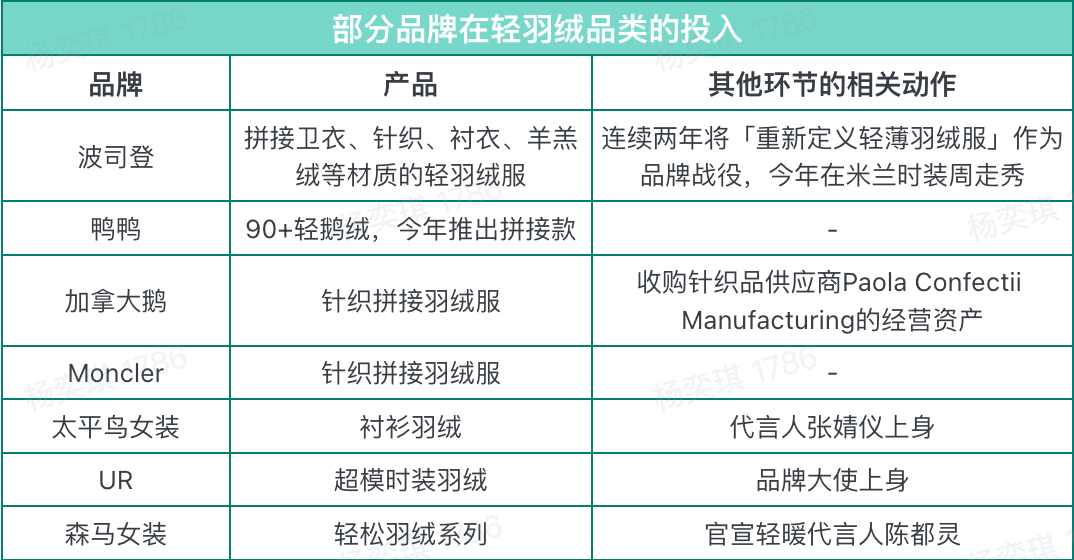 直到2016年CANADA GOOSE和MONCLER进入国内,慢慢培育起中国消费者对羽绒服的时尚认知,2018年波司登剥离四季装业务,借势国潮兴起,重新聚焦到羽绒服。随后,雪中飞、鸭鸭、雅鹿甚至是很多常规服装品牌重推羽绒服,并将羽绒服轻量化、时尚化。