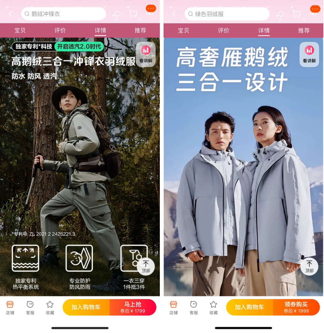 王冻洋也告诉《窄播》,冲锋衣羽绒服是鸭鸭结合近几年流行户外元素重投入的品类。因为该品类不仅具备羽绒服防寒保暖特性,还兼具了冲锋衣防水、防风、透湿性能,一衣三穿,既适用秋天的轻户外,也可以同于冬季的寒冷气候。
