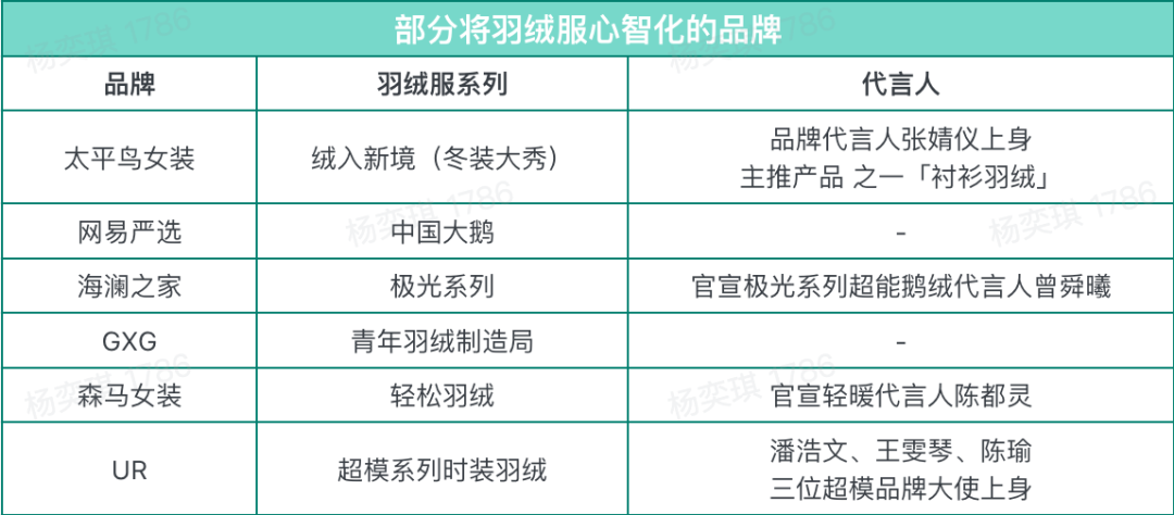很多品牌通过羽绒服系列化、代言人合作等方式,借羽绒服品类打出差异化心智。今年最为突出的太平鸟女装和网易严选。