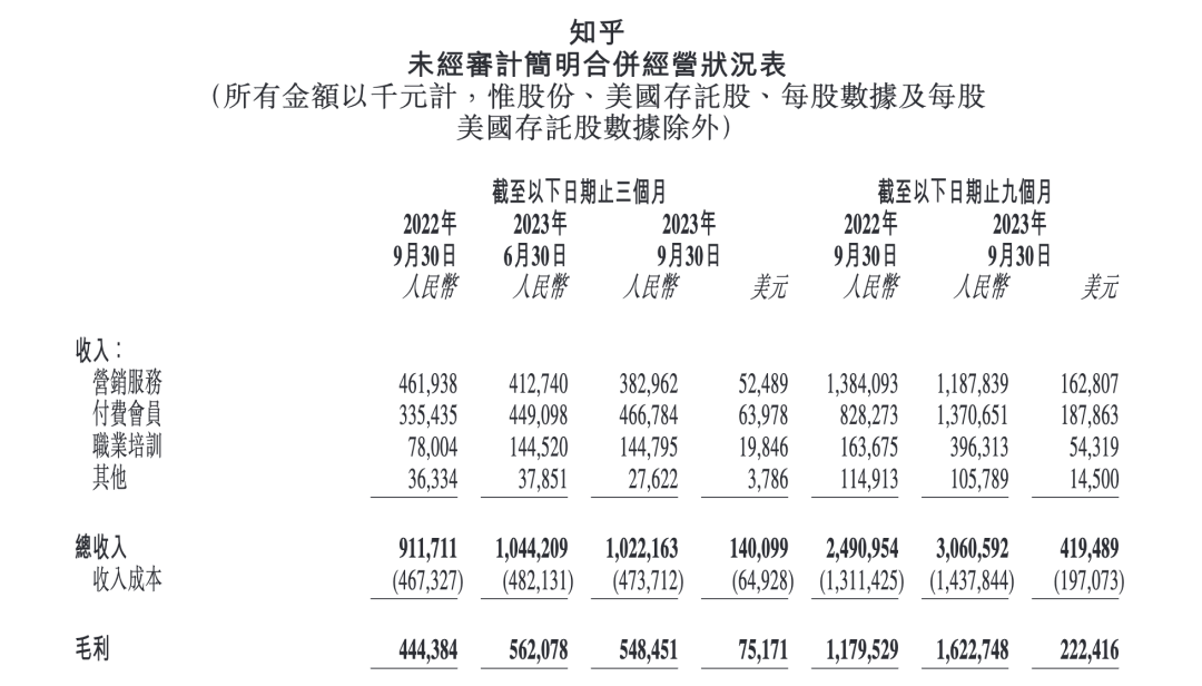 另一个则是职业培训业务。三季度来自职业培训的收入为1.4亿元,同比增长85.6%。根据电话会内容,这部分业务的增长主要得益于在线课程内容的丰富,知乎透露,当下课程链条已经囊括从考研考公到CPA、ESG等考试。