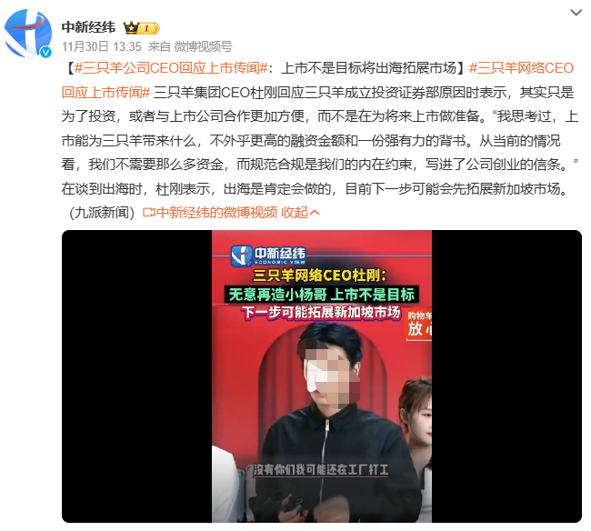 但对此,三只羊集团CEO杜刚回应称,三只羊成立投资证券部其实只是为了投资,或者与上市公司合作更加方便,而不是在为将来上市做准备。而下一步则是出海,大概是拓展新加坡市场!