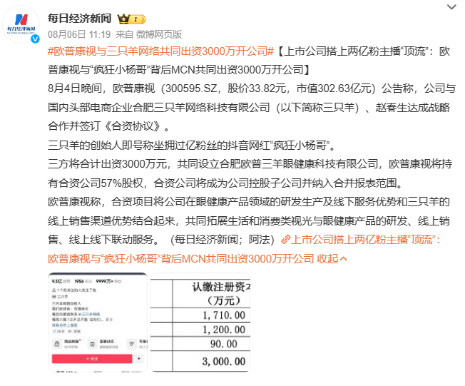 彼时,三只羊宣布和上市公司“欧普康视”达成合作,商业模式很新颖,共同成立合资公司的形式打造新品牌“梦视清”,由欧普康视提供“美瞳”等新业务线产品,小杨哥则负责线上卖货。