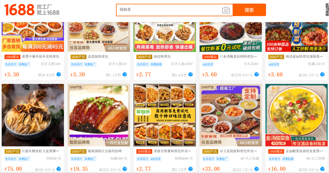 在1688网站搜索关键词“预制菜”,相关商品多达50页,包括“盖浇饭料理包”“中餐冷冻料理包”等各类菜品,十分齐全。这些标注着料理包的炒菜价格低廉,无论荤菜还是素菜,几乎都在6元以内,有些商品直接在页面注明“专注酒店食品批发”。