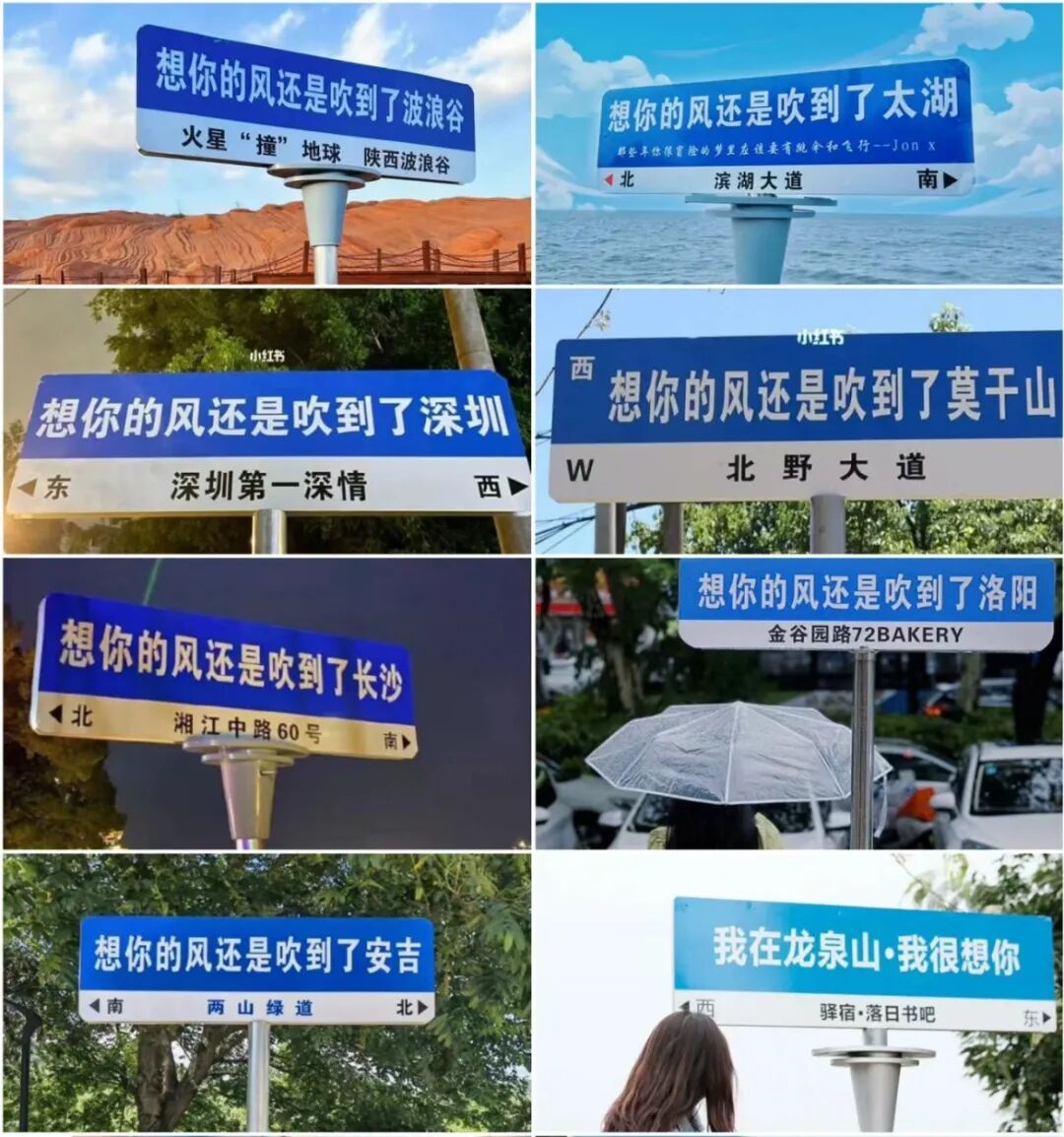 源于对网红城市旅游景点“想你的风还是吹到了xx”标语被滥用的厌恶。今年以来,网络上刮起了一阵“想你的风”,各大旅游景区和商家为了吸引顾客,提供差异化服务体验,纷纷以路牌标语+想念文案掀起网友心中的情感涟漪。