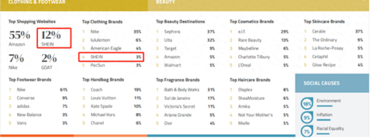 如果被问到最喜欢哪个中国品牌,大多数美国年轻人投出的答案是“SHEIN”。根据美国研究机构Piper Sandler公布的最新调研结果,SHEIN位居最受美国年轻人欢迎的购物网站第二位,以及美国年轻人欢迎的服装品牌榜单第四名。