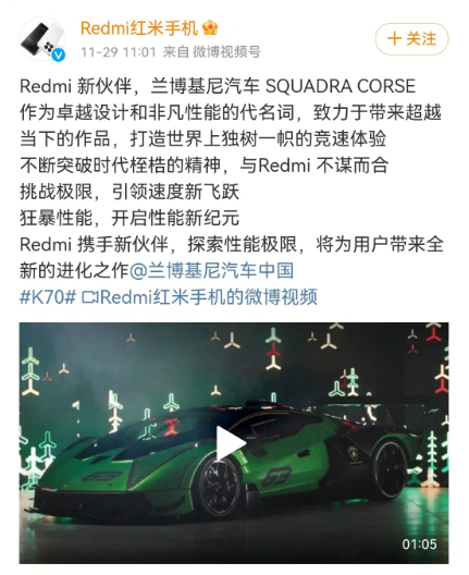 现如今,跨界已经成为了品牌营销中的一个重要手段,它能让不同类别的品牌在相互协作中发挥出巨大的联动效应。不难发现,随着行业间的相互渗透和融汇加深,想要清楚界定一个企业或品牌的“属性”,已经变得非常困难。而如何使表面不相干却又存在某种内在联系的品牌相互融合渗透,就成为了营销中的重要议题。咱就是说,看过手机和动漫、游戏IP联名吸引年轻人的,和超级豪车联名的可以说是独树一帜。去年8月份,小米宣布推出与梅赛德斯-AMG马石油F1车队的联名款——Redmi K50冠军版,获得了米粉们的关注与热议。这背后更多的是品牌对于产品性能和实力的借喻。对于超级跑车而言,兰博基尼主打卖点并不局限于产品的功能价值,反而是精神价值占据更大比重,简单来说,购买兰博基尼的人更多是要想这种身份的象征。同样的,对于Redmi K70来说,这款联名款手机的做法只能是堆料,用极致的性能来匹配兰博基尼的极速,就如搭载最新的骁龙8Gen 3芯片等等。去赋予产品一种附加价值。除此之外,品牌并没有放弃在社交平台上的营销造势。作为卓越设计和非凡性能的代名词,致力于带来超越当下的作品,打造世界上独树一帜的竞速体验,不断突破时代桎梏的精神,与Redmi不谋而合。11月29日,红米官微发布联名广告片依托TVC中的概念、价值解读,在评论区内,就引发了不少网友的应援热潮,借着Redmi K70系列新机发布之际的流量东风,通过价值性品牌相互联名的方式,充分抢夺用户注意力。