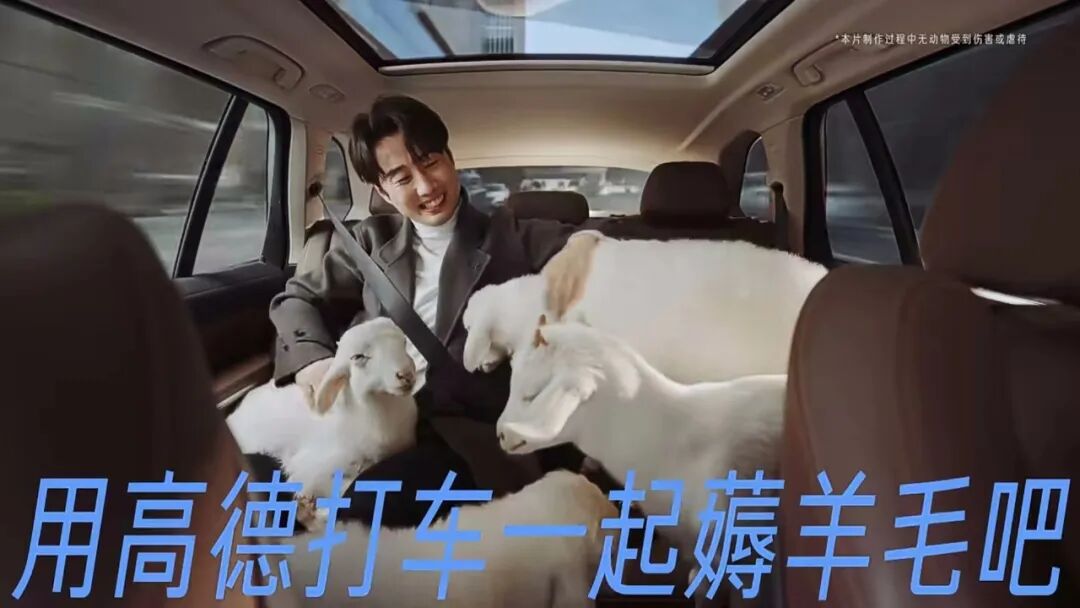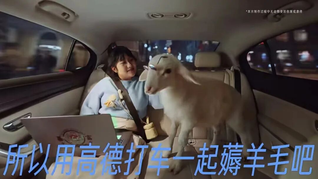 最有创意的一点呢,就是高德让薅羊毛的概念具象化,给予消费者生动的体验感——品牌搬来了一只真正的羊,并在每个场景里让演员展示薅羊毛的动作。