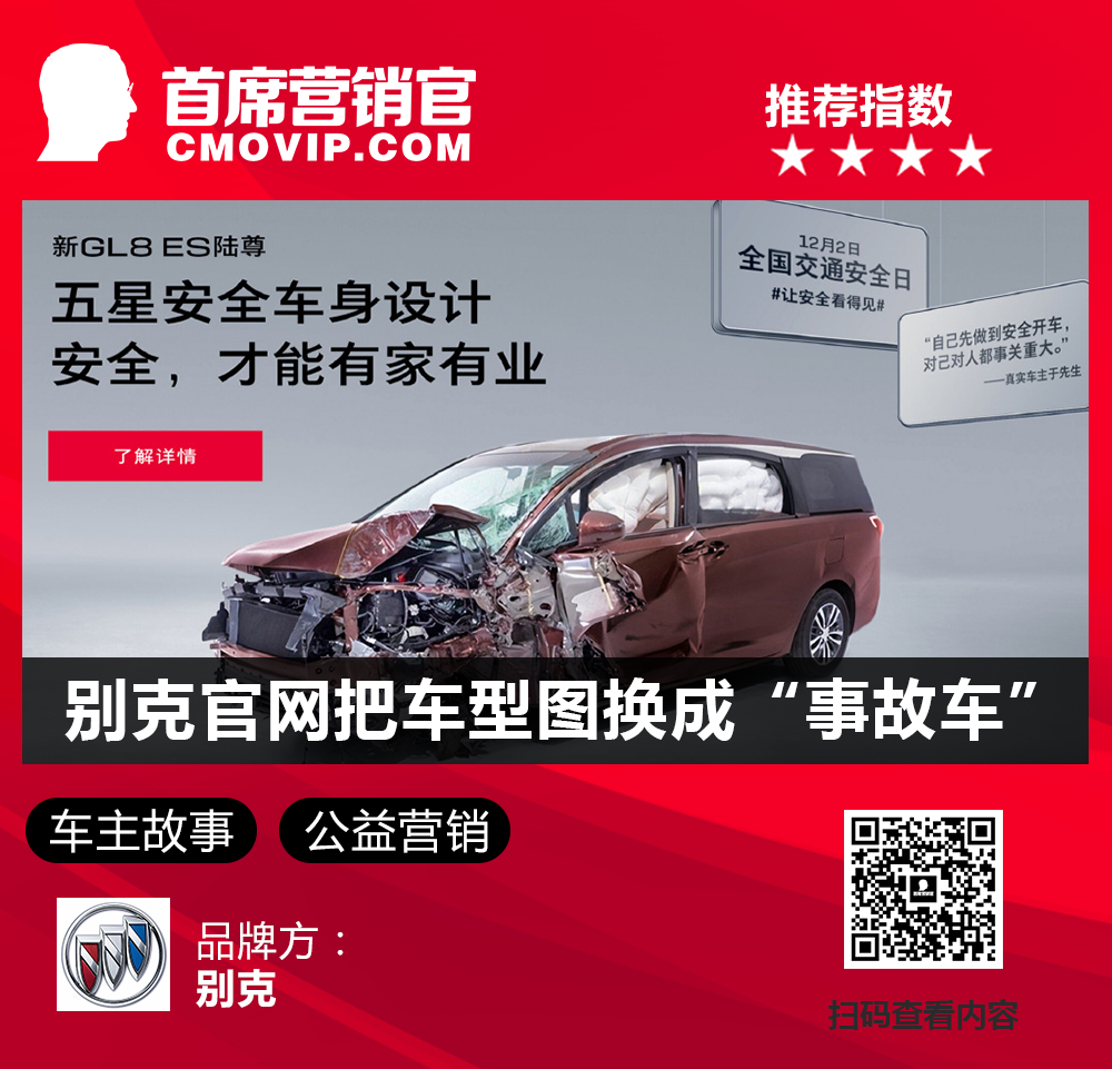 在全国交通安全日这天,别克在官网上将官方车型图全部替换成被撞坏破烂的事故车。每一张图片背后都是真实的事故、还有亲历者的肺腑证言,用来警醒大家注重交通安全,“让安全看得见”。点评:在具备特殊意义的一天,别克选择用如此新颖的方式呼唤消费者对安全的关注,无疑就“新势力”了一把,也彰显品牌对产品安全性的追求与社会责任感。