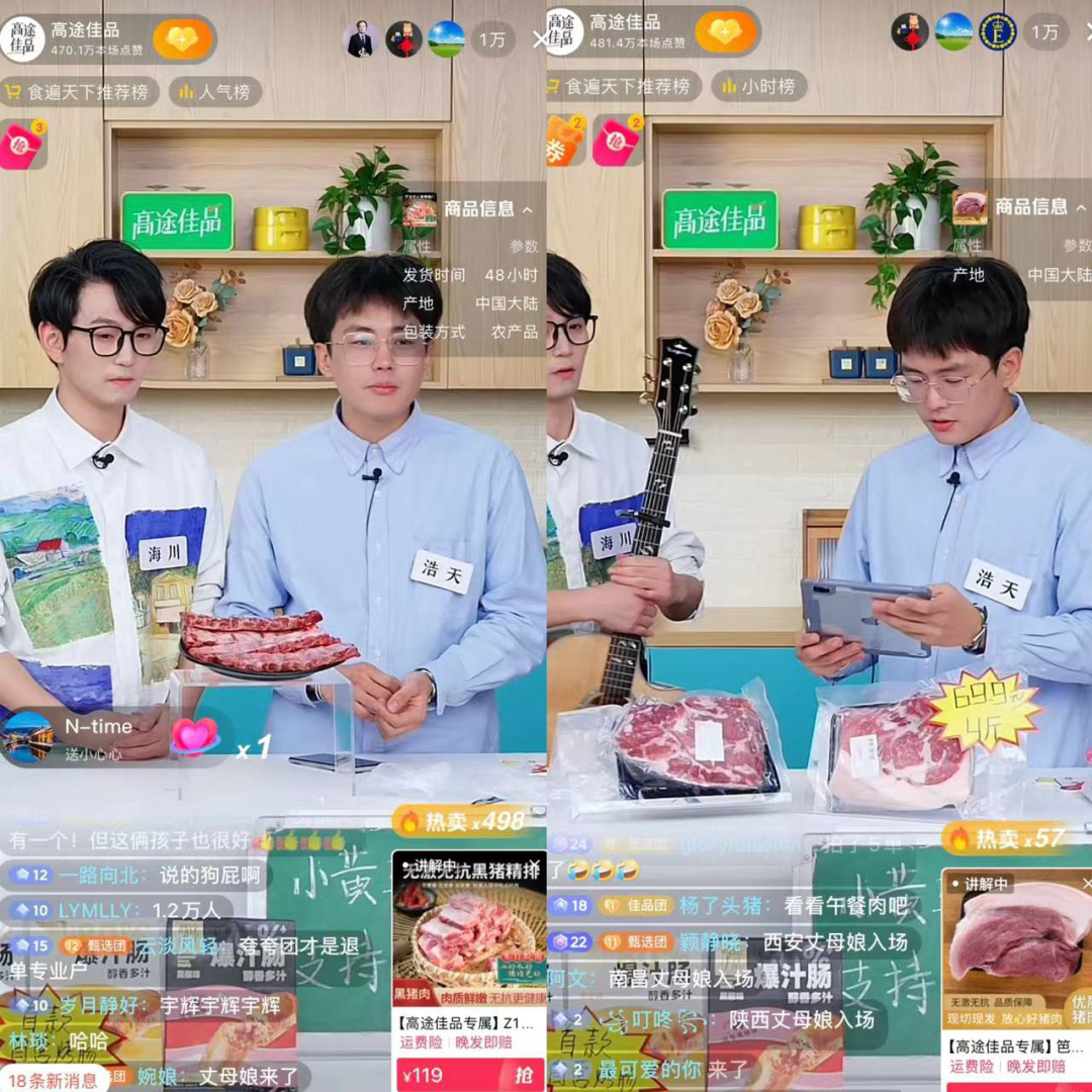 海川和浩天也没想到当晚会有这么多人涌进直播间,他们是高途佳品当晚直播的两位主播,已经直播了三个小时的两个人,面对最高1.3万的在线人数,他们诚惶诚恐,非常害怕说错话,“我说出去的每一句话,现在都需要去负责”,也在直播间多次对观众说“是我们播得好吗?您各位抬举我们了,感谢各位的抬爱”。