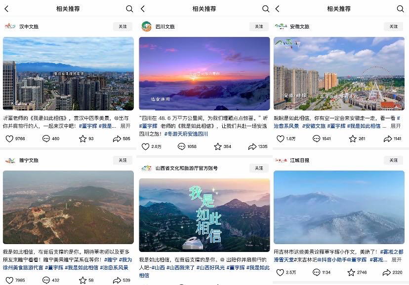 东方甄选还是只有一个董宇辉。在抖音,东方甄选的话题播放量有328亿次,而董宇辉紧随其后有260亿次,即使是俞敏洪的话题播放量也仅有66亿。而董宇辉的影响力还在持续扩大,最近东方甄选进军文旅产业,多个地方的文旅抖音账号在发布文旅视频时都使用了董宇辉的小作文,并且带上了董宇辉的话题。