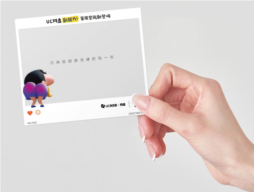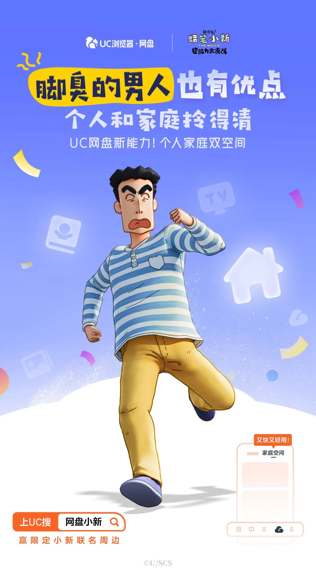 用幽默的态度对待现实,这是UC网盘此次联名活动海报的创意核心。略带冒犯的文案在蜡笔小新全家五口(野原广志、野原美伢、野原新之助、野原向日葵和小白)的形象下有了别样的幽默与共情感,特别是野原广志和蜡笔小新,一定程度是上说出了UC浏览器和UC网盘的绝大多数男性用户的心声,而UC网盘全「新」家庭空间的产品功能,给了每个「家庭人」一个理由。