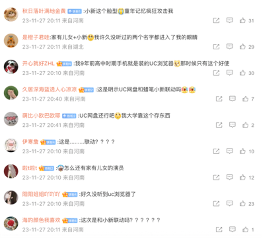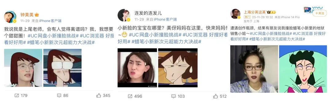 第三步,官宣期,“靠脸吃饭”的热度达人(这英、连发儿、钟美美等)下场,魔性撞脸蜡笔小新角色,引导各路达人、母婴、亲子博主参与撞脸挑战,点爆话题关注度,提升UC网盘认知度。网络讨论度高涨,网友纷纷表示“我站蜜蜂小狗一票”。