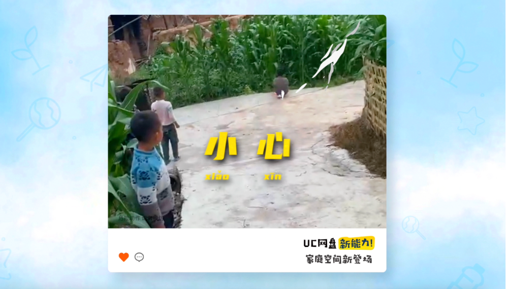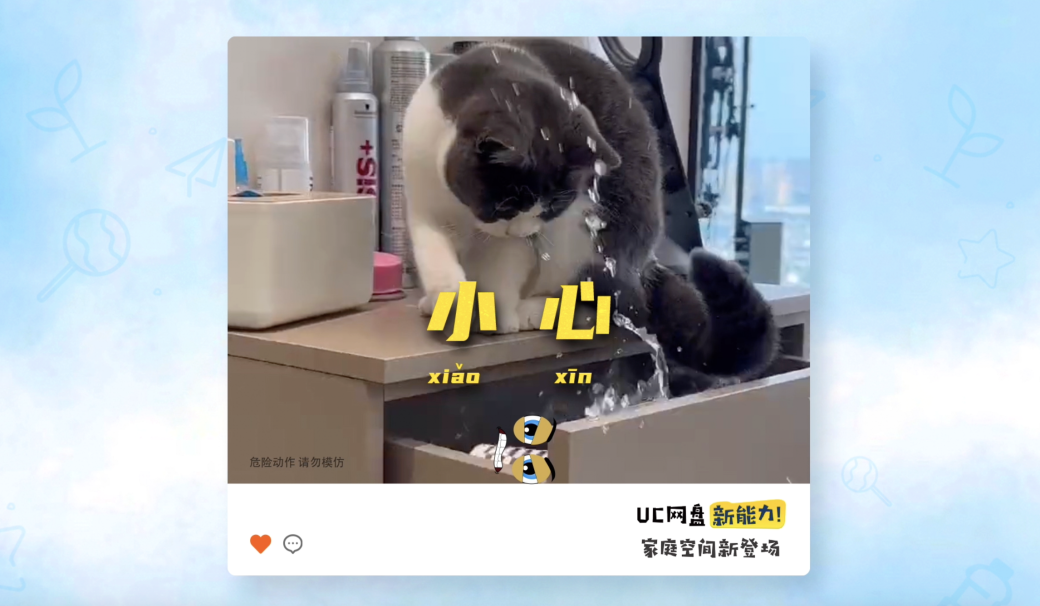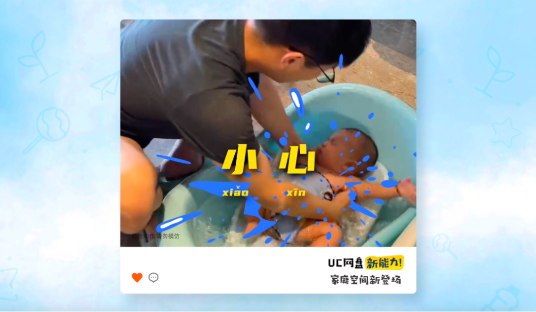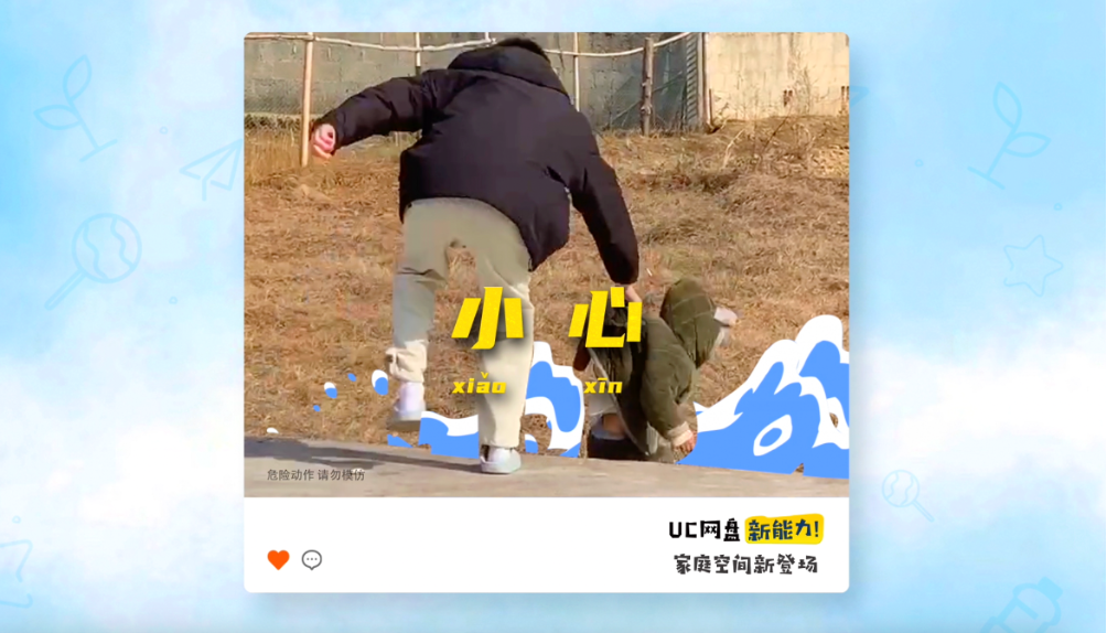 往往所谓“传播代沟”不过是不同年龄层社交语言的不同,正如“躺”文化无法完全理解“卷”文化背后一代人的家庭责任感一样。但UC网盘似乎发现了 “谐音梗”通用性。奈雪小新联名大热在前,UC网盘的广告片没有被电影宣发的素材限制,反而抓取了家庭生活里的趣味日常,以“小心”和“小新”的谐音梗趣味召唤出小新联名的全新家庭空间。最妙的是每个“小心”场景素材的选择,既展现了家庭的欢乐瞬间,又没有触发“小心”的危险联想,还以记录定格的方式关联了家庭存储的产品身位。