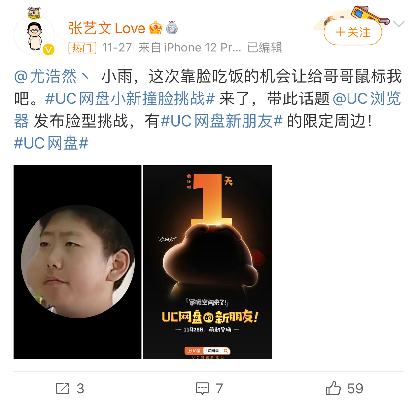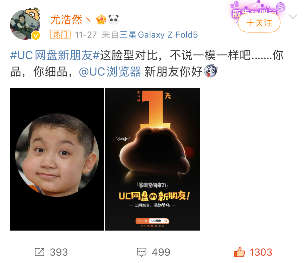 第二步,预热期跨圈童年记忆《家有儿女》,具有同款小新脸的小雨和鼠标在社交平台“冒名认脸”UC网盘新朋友,以#夏东海你儿子脸型输了# 制造联名噱头引发海量“回忆杀”。