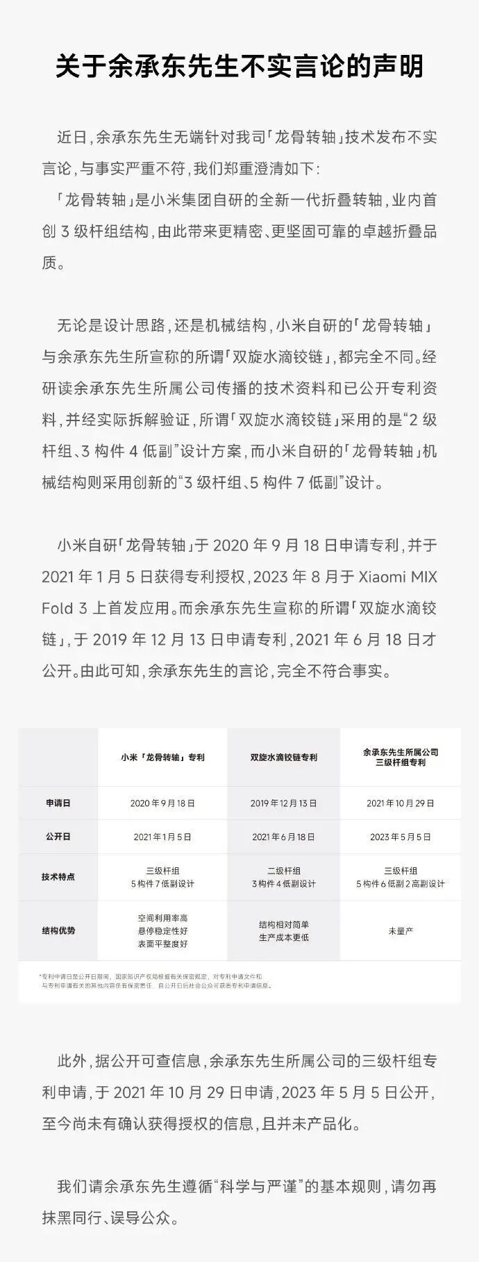尽管这段表达并没有指名道姓,但在宣传上使用“龙骨”名词的只有小米一家厂商。很快,小米官方账号便在微博上激情开麦,回应了有关“龙骨转轴”技术的质疑。