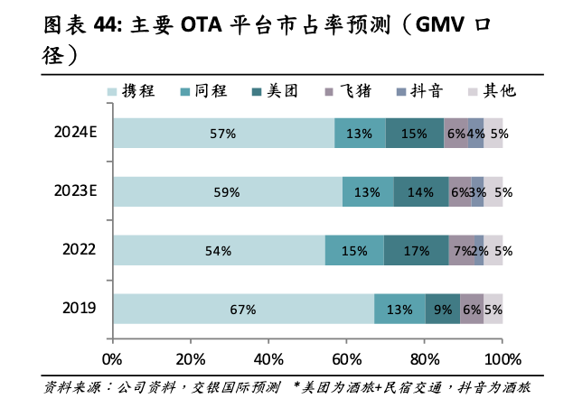 抖音的强势猛攻必然会冲击原有的市场格局。据交银国际报告,2019年,携程的市占率为67%,到2022年下降到54%,美团从9%上升至17%,从占比看,抖音的份额还不高,2022年占2%,预计2023年占3%。