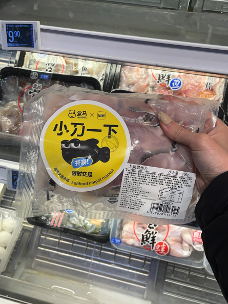 二是恰到好处打造联名商品,在名字上表达出两个品牌的调性,比如联名款【盒马宝鲜 黑鱼片】黑鱼已小刀(小刀一下),一语双关道出处理方式已小刀,还有闲鱼的小刀,经济实惠。
