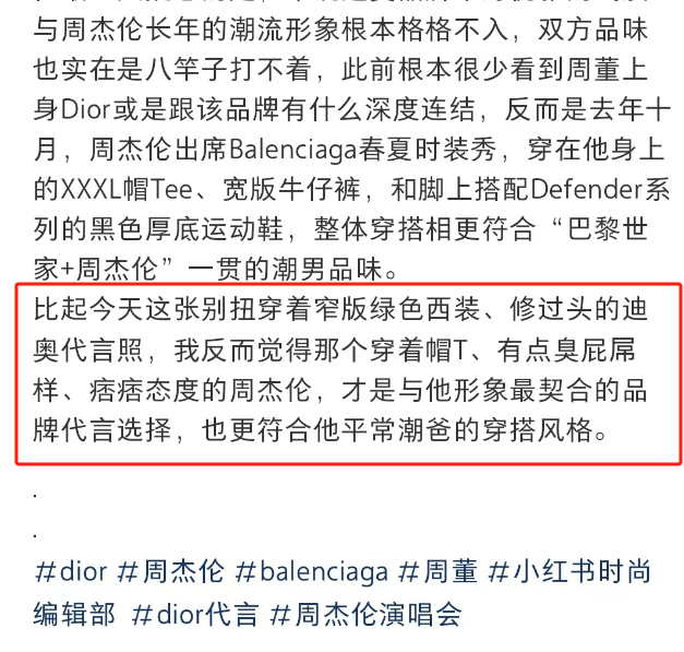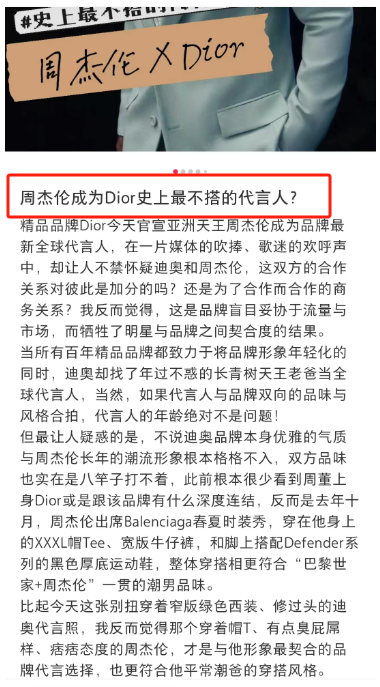 大家的关注主要集中在代言人和品牌的“不搭”:品牌不配、品类不搭、形象不符合,再加上迪奥本身就被贴上辱华标签,多少影响了周杰伦的口碑。