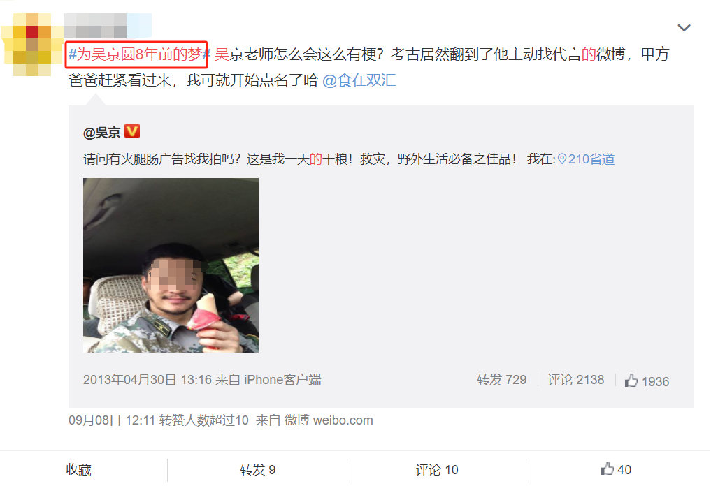 上一次看到圆梦代言还是吴京,吴京喊话火腿肠品牌8年后,双汇有一天突然官宣。