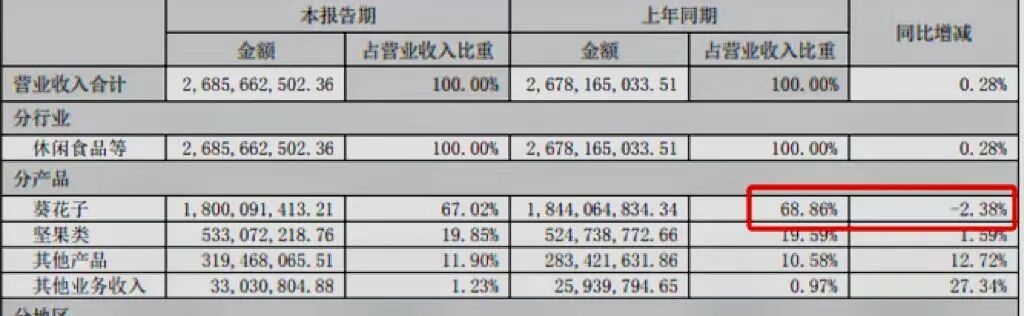 虽说洽洽产品线包括瓜子、坚果等,但洽洽中报显示,瓜子类产品一直是公司核心收入大头,占比接近69%,也是洽洽半年报中唯一收入下滑的产品。