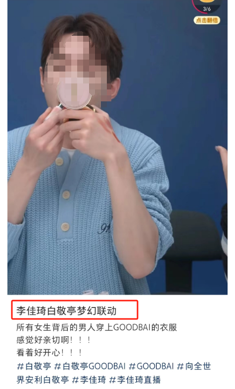 去年1月份的直播带货中,李佳琦穿上白敬亭的GOODBAI针织衫火了,被网友喊话梦幻联动。