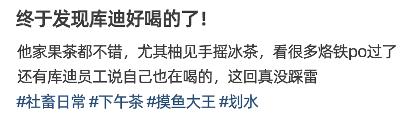 “奶茶店的果茶总有股直饮水的味道,但是库迪就不会,不知道是不是因为它是咖啡店,都外接的大桶矿泉水。”