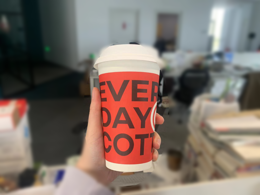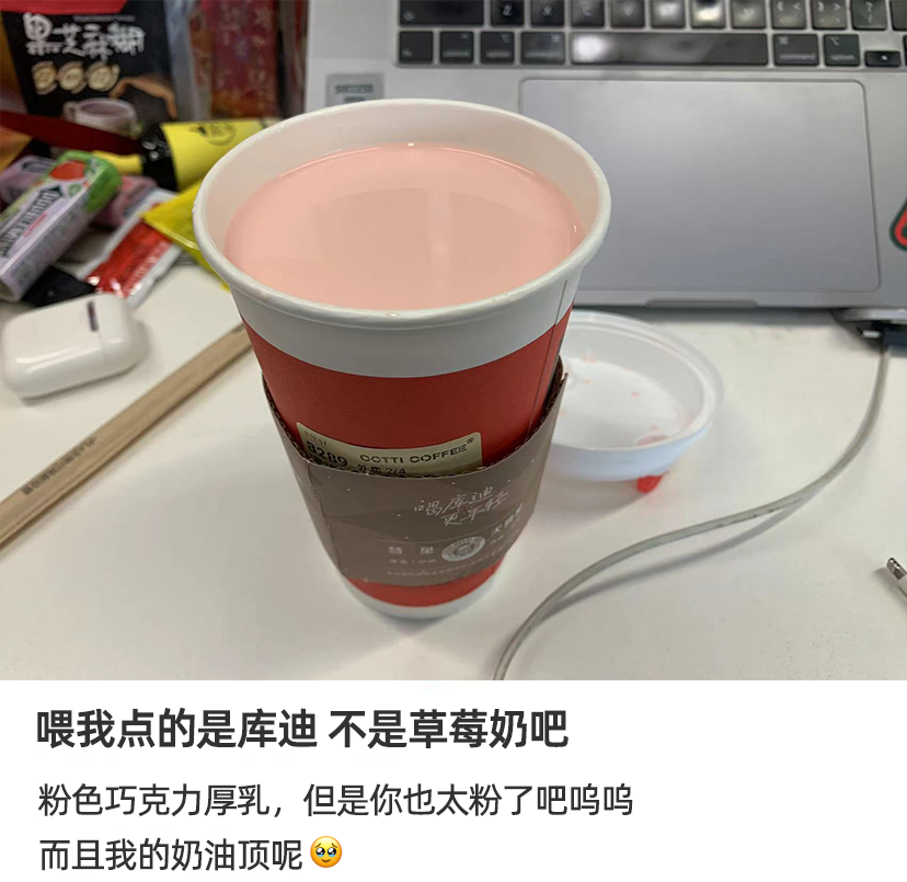 瘦肉的公司楼下就有家库迪,她每周会喝上3、4次。瘦肉不太喜欢咖啡的苦和酸,所以在夏天买果味的库迪,冬天则是奶味的;但库迪有时饮料感过重,提神的咖啡味不足,她又会在公司的咖啡机打出一杯shot,加在里面。