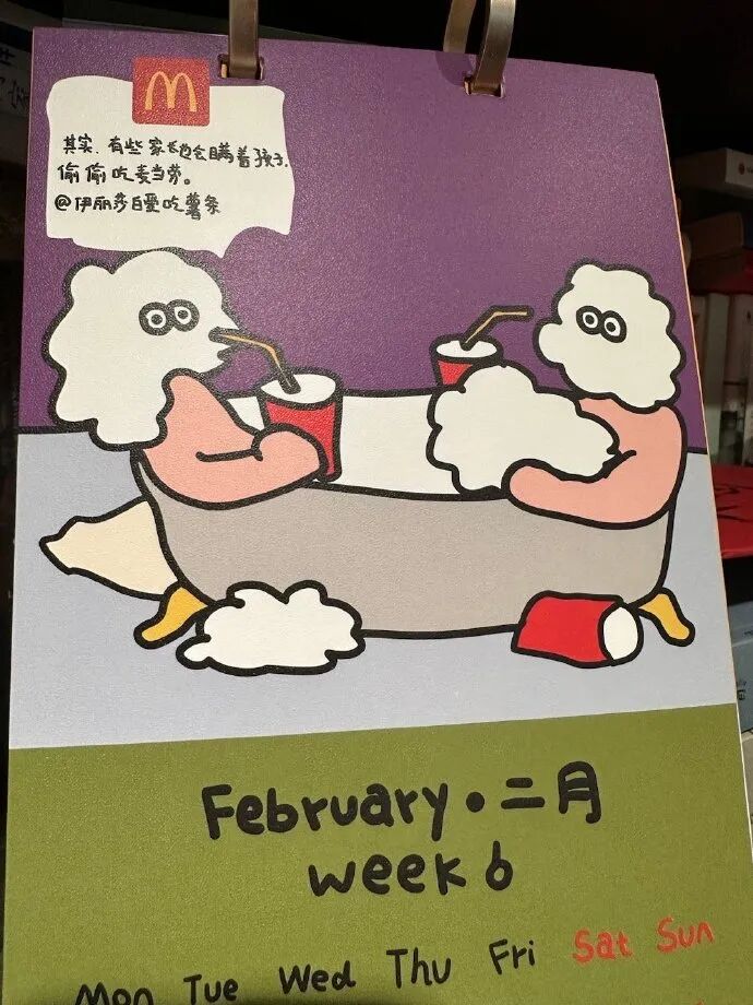 新年到来之际,麦当劳推出了一本「麦麦2024粉丝周历」,希望陪伴粉丝度过温暖又精彩的新一年。新年日历每一页以“周”为单位,整整53周的周历,收录了53条来自铁粉的真心话文案,配上53幅脑洞大开的创意插画,主打一个俏皮可爱风格。