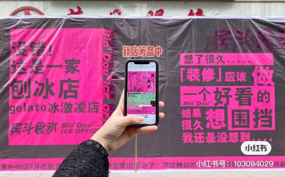 下面这个刨冰店的围挡文案就比较碎碎念了,或许也是为了契合他家碎碎冰的主营业务。