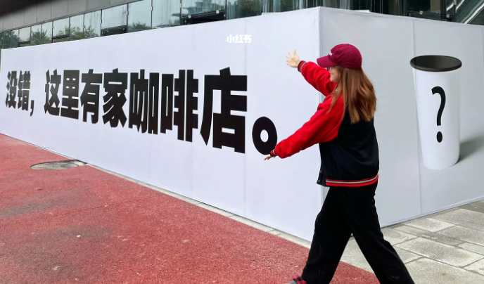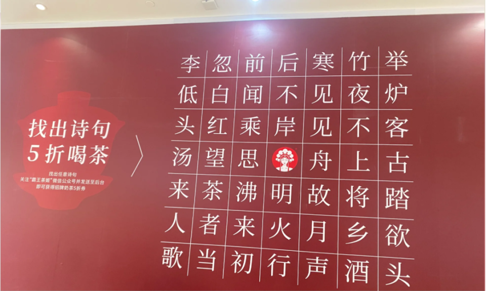 而霸王茶姬在北京开店的围挡,就比较有文化了,在围挡上拼出唐诗,关注5折喝茶。