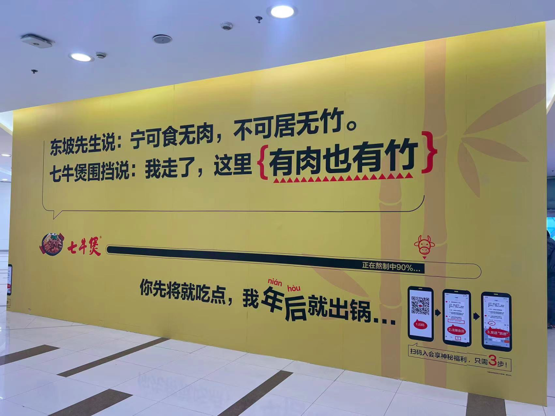 这句就很调皮了,意思是同一楼层甚至统一商场的餐厅你可以先凑合吃,等我年后开业,就专吃我一家就行。一个人吃牛煲,一群人更要吃牛煲——在家里吃牛煲,在外面更要吃牛煲——不开心吃牛煲,开心了更要吃牛煲——失恋了吃牛煲,热恋了更要吃牛煲——卷事业吃牛煲,休息了更要吃牛煲——孤单时吃牛煲,欢聚时更要吃牛煲……无论开心难过、失恋热恋、躺平卷起……都可以吃牛煲,因为好吃健康又是老少皆宜,只要吃饱了,就有力气对抗这个XX的世界。