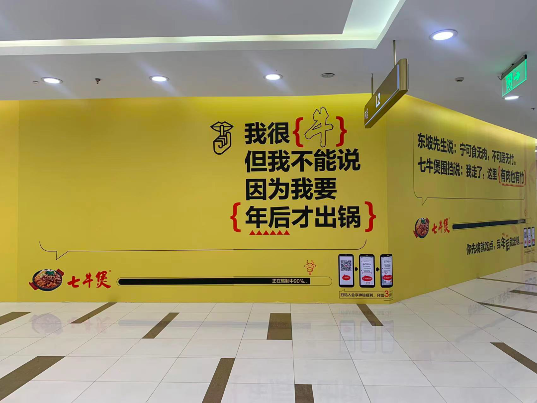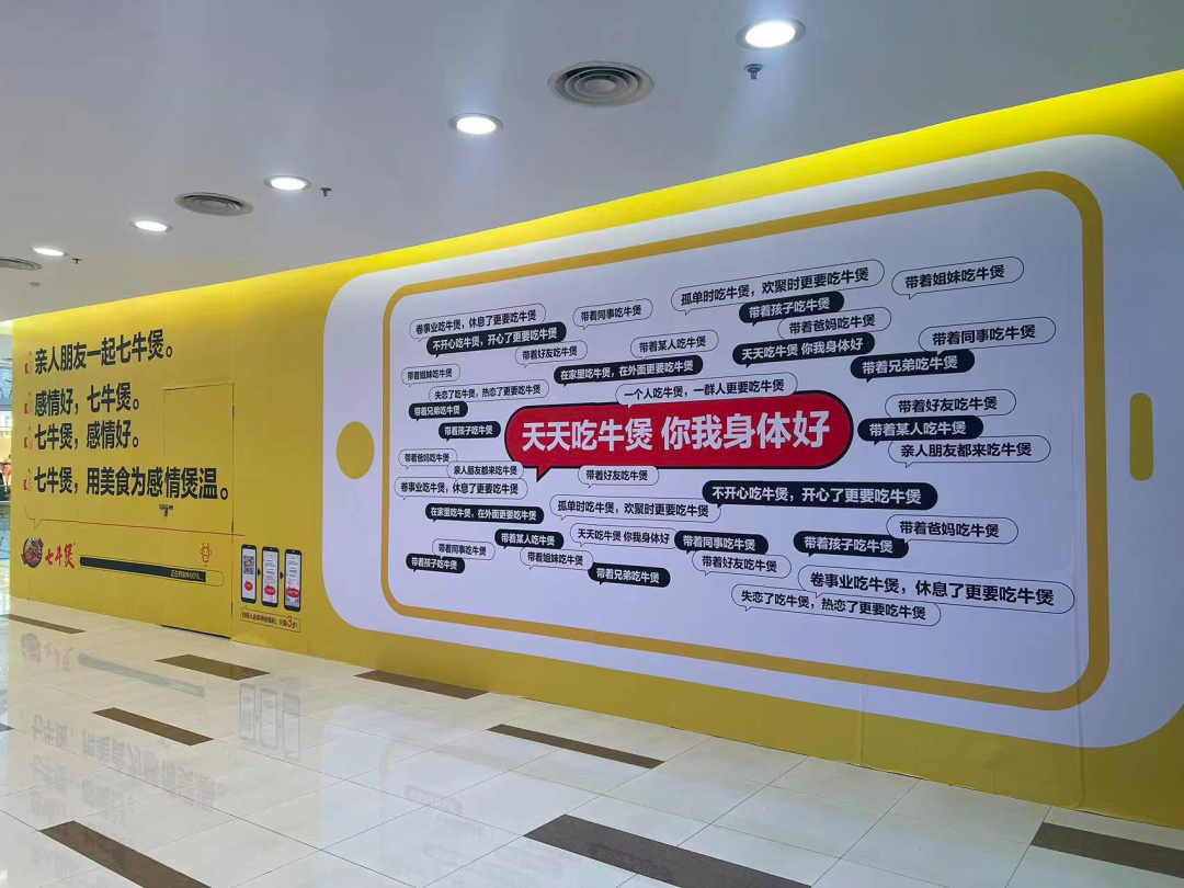 这是一家开在上海“凯德闵行商业中心”的连锁牛煲品牌,叫「七牛煲」,店名应该是一个谐音梗,因为上海话的“七”和“吃”发音是一样的。