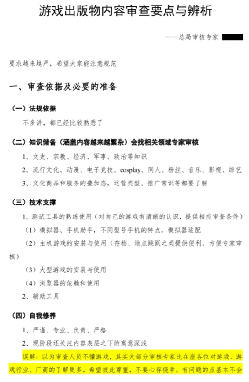 2021年9月的一次会议上,一位总局审核专家曾面向游戏从业者做过一个名为《游戏出版物内容审查要点与辨析》的报告,专家特意指出部分游戏公司存在一个误解——以为审查人员不懂游戏,但其实大部分审核专家比在座各位对游戏、游戏行业、厂商的了解更多,希望彼此尊重,不要心存侥幸,有问题的点基本不会被遗漏。