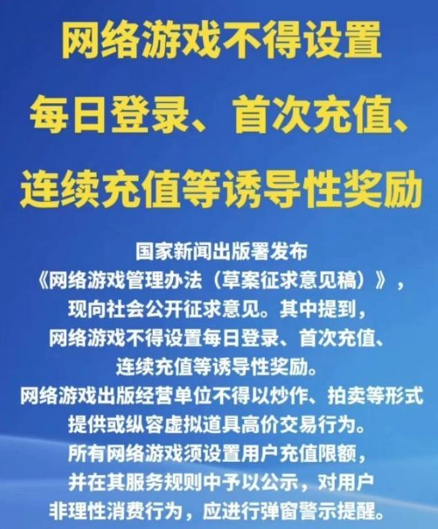《征求意见稿》称,网络游戏不得设置每日登录、首次充值、连续充值等诱导性奖励。网络游戏出版经营单位不得以炒作、拍卖等形式提供或纵容虚拟道具高价交易行为。所有网络游戏须设置用户充值限额,并在其服务规则中予以公示,对用户非理性消费行为,应进行弹窗警示提醒。
