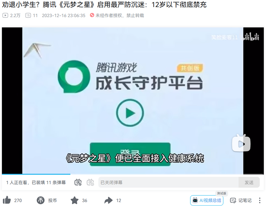 ▲图:一位B站UP主详细介绍《元梦之星》启用的最严防沉迷系统