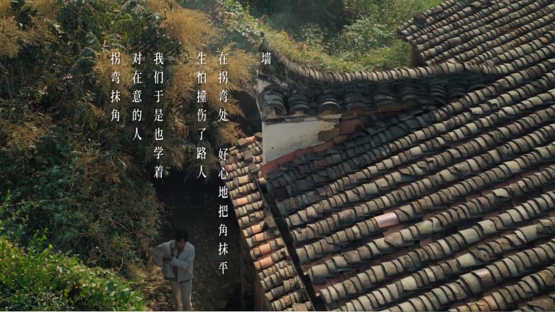 出自江西景德镇浮梁县宣传片,以墙的拐角比喻我们对在意的人拐弯抹角,形容巧妙,不止墙,浮梁还用了多个事物去形容人生。比如将长大后比喻为发酵过的茶,别有一番味道。